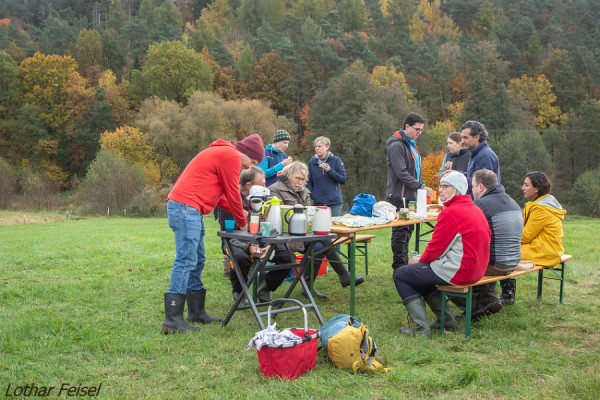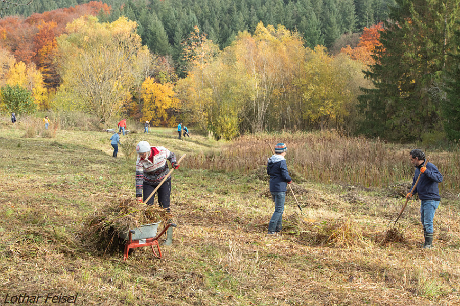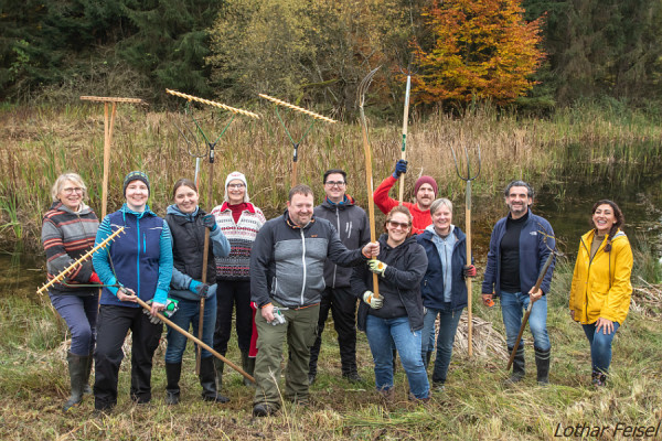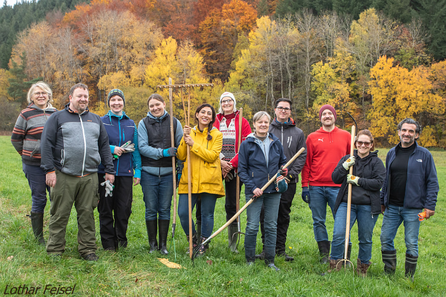 Am 31.10.2025 hatten wir bei angenehmen Temperaturen und umgeben von herbstlich gefärbten Waldbereichen tatkräftige Hilfe auf unserer Fläche zwischen Ober- und Unterrosphe. Zehn Mitarbeiter/innen unterstützten uns mit ihrer Arbeitskraft beim Mähen und dem Abräumen des Mahdgutes rings um unseren im letzten Jahr angelegten Teich.
