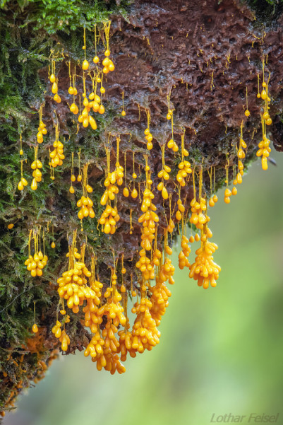 Im - frostfreien - Winterwald "verziert" der Fadenfrucht-Schleimpilz (Badhamia utricularis / Physarium utriculare) modernde Äste und Stämme von verschiedenen Baumarten oder die auf ihnen lebenden Fruchtkörper holzbesiedelnder Pilze.