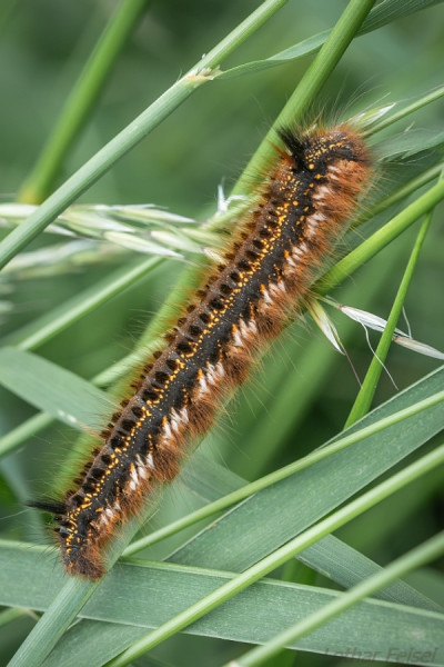 Weitaus häufiger als die "fertigen" Falter (Foto oben) findet man die, auch am Tage aktiven, auffällig gezeichneten Raupen der Grasglucke (Euthrix potatoria) (Foto unten).