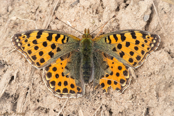 Der Falter lässt sich gut an dem dicken schwarzen Punkt nahe der Flügelbasis auf der Hinterflügel-Unterseite von anderen Perlmutterfaltern unterscheiden. Die Rote Liste Hessen führt diese Art schon als "stark gefährdet" (2). Auf dem obigen Foto saugt ein Falter im zentralen Burgwald an einer Arnika, die bei den hessischen Pflanzen ebenfalls zu den "stark gefährdeten" Arten zählt.