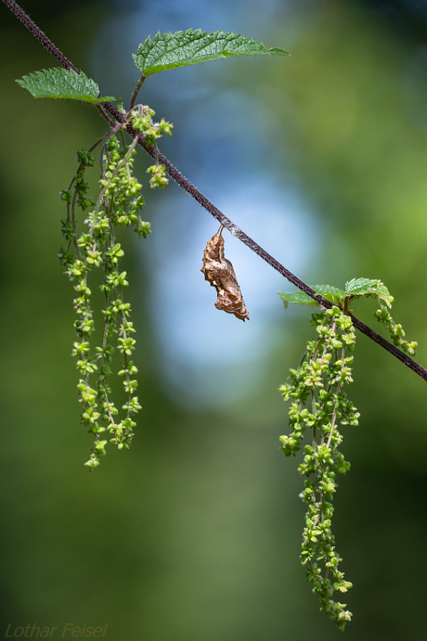Eine C-Falter-Puppe hängt frei an einem Brennnessel-Stängel und wird schon in ein paar Tagen den "fertigen" Falter entlassen...