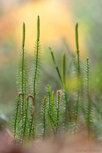 Nach der Schneeschmelze im Frühling leuchten die vertrockneten Sporenstände des Keulen-Bärlapps wie kleine Getreide-Ähren zwischen dem alten Heidekraut hervor. Während die übrige Pflanze auch im Winter grün bleibt, sterben die letztjährigen Sporenstände ab und nehmen eine fast goldene Färbung an.