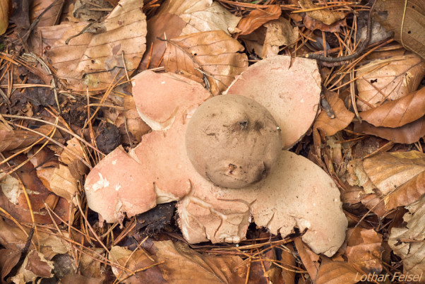 Die Hessische Rote Liste führt mehr als ein Dutzend Erdstern-Arten auf. Besonders die kleineren Arten dieser interessanten Pilz-Familie bilden z.T. skurril aussehende Fruchtkörper, so wie dieser Kragen-Erdstern (Geastrum striatum). Seine kugelige, helle Endoperidie, welche das Sporenpulver beinhaltet, misst nur ca. 1,5 cm.